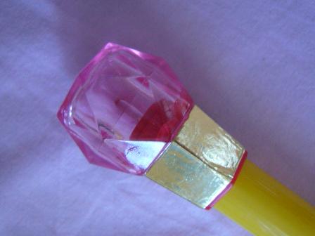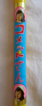 こちらで紹介している物と違って、これは電池を入れると両方の先端のピンクの宝石が赤く光るようになっています。番組でも、魔法をかける時に光っていたので、こちらの方がよりなりきり度がアップしていると思います。左右両方が光るというのもイイですね~。長さは約60センチで、前回のよりも一回り小さいですが、このくらいが丁度いいと思います。真ん中に大場さんのシール付き!誰が見てもまさしく「コメットさん」のおもちゃだ!!