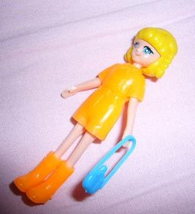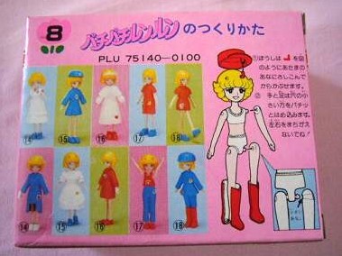 右は、組み立てて服を着せたところです。身長は8センチくらいです。この人形、不器用な私にはとても扱いの難しい物でした。というのも、組み立てているうちに目のシールが剥がれるし、ブーツはいいのですが、靴はいじっているうちにすぐに脱げてポトッと落ちてしまいます。目シールはあまりに剥がれやすいので(約30年も前に貼られた物なので、粘着力も劣化してるんだと思います)、接着剤でシールの上からコーティングしてしまいました・・。