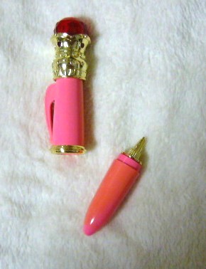 ギミックは、右の画像のように引っ掛ける部分を押すと上の赤い宝石が光る、というものです。後は単なる黒いボールペンなので、使おうと思えば職場でも使えます(笑)。ただ、私が持っている物はインクが出ないので、どうにかしないとダメですね~。市販の物を加工すればインクの交換ってできるんでしょうか。