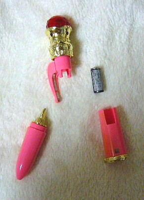 初期のシリーズが放送されていた時は「ピンクなネイグロス」はギミックがないのに高い、「まぼろしの銀水晶」は水晶の色がテレビと違う、「ムーンスティック」も月の形がテレビと微妙に違う・・等あら捜しばかりしていて、なぜか素直におもちゃが欲しいとは思えませんでした。しかし、そんな中でこの「ライトな変装ペン」だけは本編のデザインに忠実だし、普通にペンとして使えるということで唯一「欲しい!」と思わせるおもちゃでした。スーパーのおもちゃコーナーに行っては手に取って見つめるだけの日々。とっても欲しかったけど、中学生がお小遣いで買うには高かったんですよね~(>_<) 当時の私の月収が2000~3000円くらいだったのに対してこのペンは2500円~3500円の間の値段だったと思います。たかが電池を入れてライトが点くだけのボールペンがなんでこんなに高いんだ~!!と思ってついに買わずじまいで、10数年の月日が経ってしまいました。今になってこんなに値段が上がってしまうなんて、こんなことならお年玉でも溜めて当時定価で買っていれば良かった・・・と相当後悔しました。