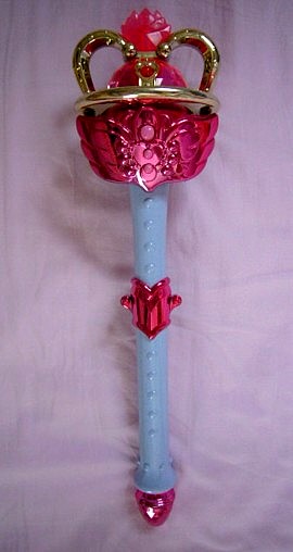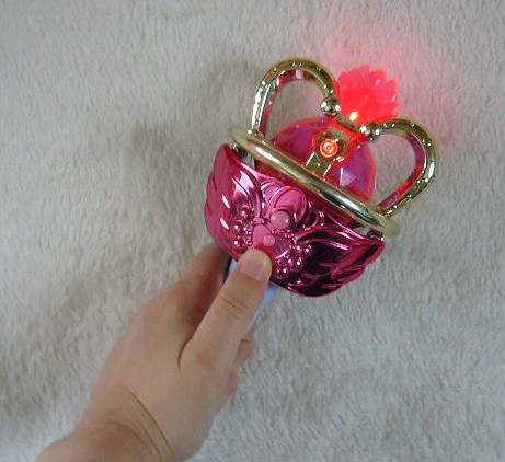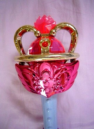 光っている所です。ギミックは、2つのボタンを押すと花と惑星みたいな部分が光り、それぞれ違うメロディが流れ、一番上にある突起がダイヤル(?)というかネジみたいになっていて、左右に回すことによってそのメロディのテンポを速くしたり遅くしたりできる、という面白いものです。これは再販版のギミックですが、96年の物も同じなんでしょうか?あと、「エターナルムーンアーティクル」の再販版ってなかったのかな??他の変身アイテム・攻撃アイテムは全部再販されてるのに・・。