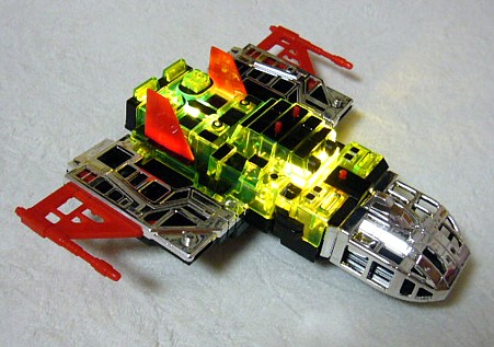 戦闘機がロボットになるという、いかにも男の子が喜びそうなオイシイ設定なのですが、残念ながらこれは単体でしか遊べず、フレームロボに合体させたりすることができません。その代わり、このおもちゃのセールスポイントは「光る」ということです。「超電送DXレザリオン」では分散合体&電送を再現(電送はイメージですが)していたのに対し、こちらは光を再現したというわけですね~。あと、コクピット部分が飛び出すのも再現されてますね。