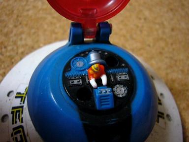 前面にある赤い部分を押すと、ガチャン!と金属音を立てて操縦席が立ち上がり、中のメカが見えるようになっています。他にも付属品があるようなのですが、私が入手したのは本体のみでした。あと、下には車がついていてコロコロ転がすことができます。