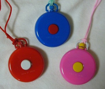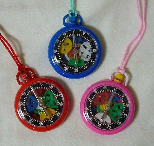 かなり小さい頃、よく遊んでいた思い出のおもちゃで、数年前にふと思い出し「小さい頃持っていた時計みたいなおもちゃは一体何だったんだろう?」とずっと気になっていていた物だったんですが、ある日ネットで同じタイプのおもちゃの画像を発見して「これだぁぁあ!!」と判明。それからずっと探し続けていたんですが、やっと入手することができました。私が昔持っていたのは黄色だったと思うんですが、赤・青・ピンク、こんなにカラフルに揃ってしまいました(^^ゞ
