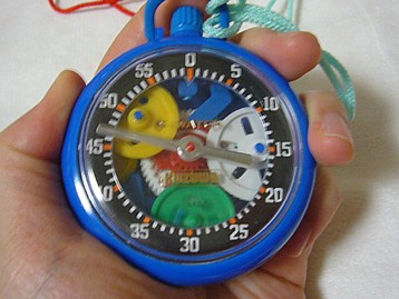 遊び方は、後ろに付いている丸いボタンを、時計周りに一周回して上のスイッチを押すと「カチカチカチカチ」と結構大きな音を立てながら針が回るというモノ。ゼンマイ仕掛けになっています。一応秒数は60秒になってますが、実際に回る時間を時計で測ってみたら約20秒で一周するようです。秒数は飾りみたいな物で、全く意味がありませんでした(笑)。