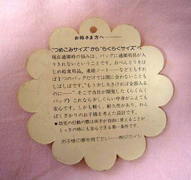 左:ルンルンのバッグ類に必ず付いていたタグ。裏には名前や住所が書けるようになっています。