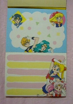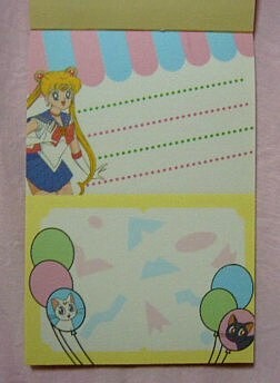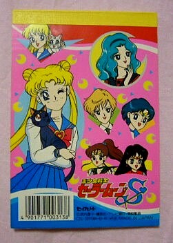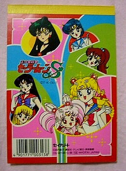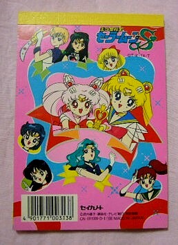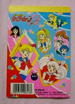 表紙の方は「セーラームーンR」の映画の時の絵(しかも、「みんなうさぎちゃんに出会う前は孤独だったわ・・」と回想するシーンで使われていた物・・。なぜあえてこのシーンを選んだのか謎です・・・。もっと楽しいシーンにすればいのに・・・セーラームーンと手前のうさぎの組み合わせも謎・・。)メモの方は「R」か「S」のOPの絵柄ですね。