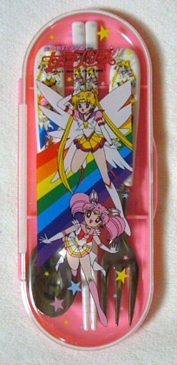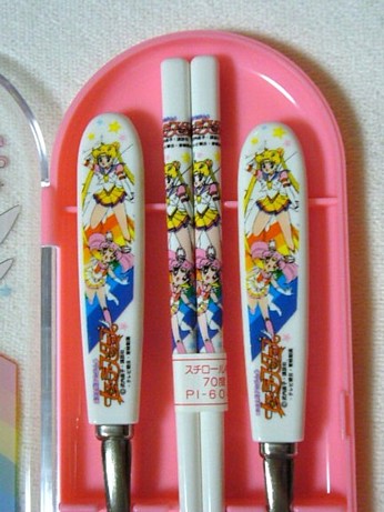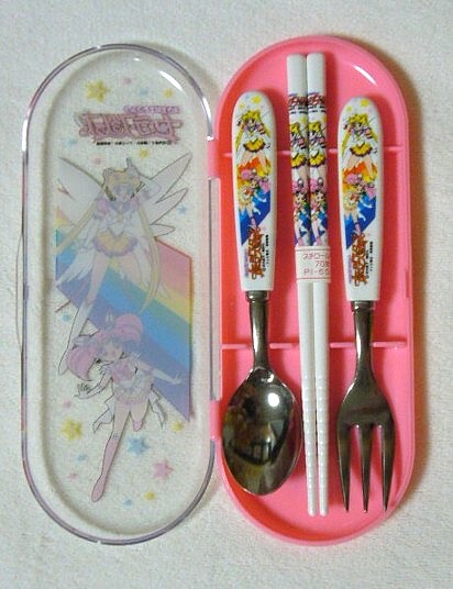 セーラースターズのカトラリーセットです。これは番組が終了した年かその次の年に地元の大型スーパーの食料品売り場で購入した物です。家族で買い物に来ていて、どうしてもコレが欲しくなった私は一人で誰にも見られないようにこっそりレジに持っていったのでよく覚えてるんですよ(笑)。ビニールに入った状態のまま保管していたのでピカピカです。箸・スプーン・フォークの3点セットは箸箱以上にとても豪華に見えますね。 中身です。イラストが細かくて中身も豪華ですね。 2010年8月14日 記