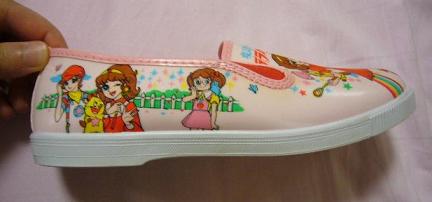 以前「花の子ルンルン」の靴をご紹介した時にも触れてますが、一昔前は男女問わず2、3歳~小学校の低学年くらいまでの子がよく履いていました。紐などの装飾がなくて履きやすいし、表面がビニールというかナイロンというか、とにかく濡れても大丈夫な素材で出来ていて、とても便利だったように思います。アニメのキャラが描かれている物以外の物まで入れると、多分ほとんどの人が一度は履いているのではないかと思います。