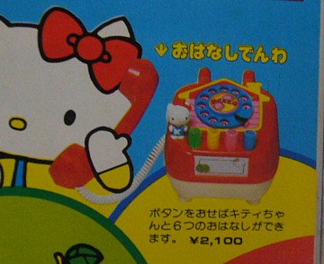 「おはなしでんわ」これは少し前まで売ってあったような新しい感じがします。今売られててもあまり違和感がない・・・ことはないか・・。今の子が見ると、これが電話だと気づかないかも・・・。ボタンを押すとしゃべる電話ってこの頃流行だったんでしょうか。私も、キティちゃんの物ではありませんが、ピンク色のボディで、キャンディキャンディみたいな女の子のイラストが付いた電話を持っていました。