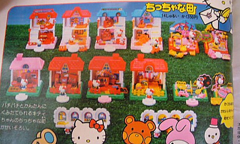 「キティちゃんのちっちゃな町」、ついに私が持っていたのが乗ってました!!一番手前にある白い並々の窓(当時から謎なんですが、これって窓であってるんでしょうか??)とあまり写ってませんが、その前にある小さな人形のセットでした。人形は確かキティちゃん一家だったと思うんですが、詳しくは覚えていないのが残念・・。本当はその後ろにあるお家が欲しかったんですけどね~。特に2階建てのが豪華でスゴイですね。それにしても、これと手前の窓&人形セットが同じ350円ってすごく差があるような気がするんですが・・。
