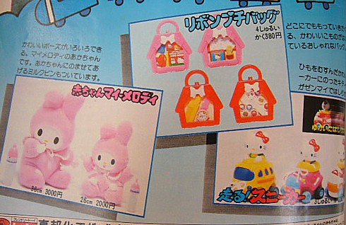 「赤ちゃんマイメロディ」、これは欲しい!!!子供の頃よりもむしろ今欲しい(笑)!!!指をくわえているところをみると、モンチッチみたいに体がぬいぐるみで顔や手がソフビ製なんでしょうか??哺乳瓶がついてるところがまたイイですね~。こんなぬいぐるみがあったなんて始めて知りました。