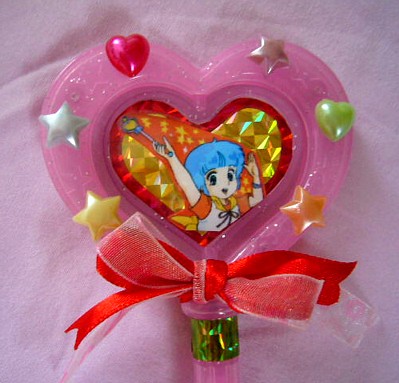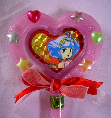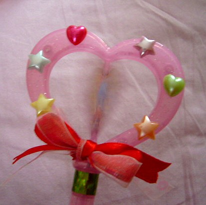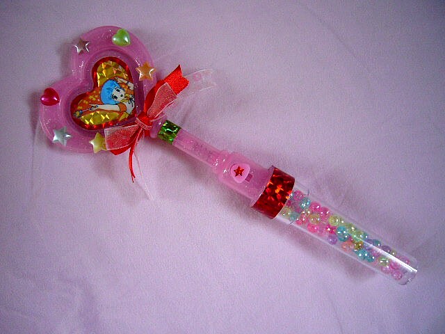 実はこのお菓子、ヒロインアイテムのおもちゃ愛好家の中では「クリィミーステッキ」に似てる!!」と話題になった一品だったりします。形ももちろんのこと、レバーを下に下げるとハート部分が回転する所まで同じなんですよ!本物と違ってバネ動力(?)ですけどね。それでも雰囲気はバッチリです!!