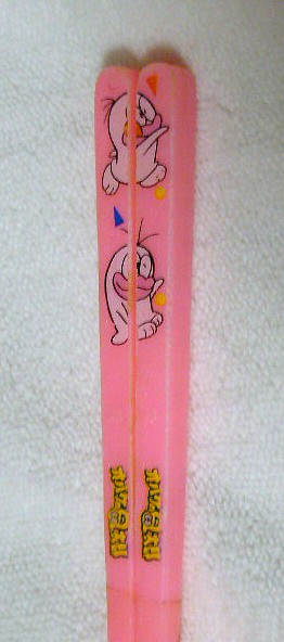 私が小学校低学年の頃使っていたオバQのお箸です。それにしてもQちゃんグッズはピンクが似合うなぁ~。こんな物まで未だに保存してるんだから、部屋が片付かないはずですよ(笑)。しかも、バラバラにならないようにセロハンテープで止めているという徹底ぶり!!このテープを貼ったのも10年以上前なのでかなり劣化して変色を始めてます・・・。 2010年1月5日 記
