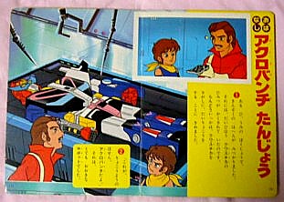 アクロバンチって本編でも人物との対比が無茶苦茶でツッコミ所満載だったんですが、絵本でもこのとおり・・・。ジャンボマシンダーとまでは言わないけれど、おもちゃ屋に飾ってあるようなロボット(人と同じ身長)程度の大きさしかありません・・・。蘭堂一家はコレの中で生活してるんですけどね^_^;