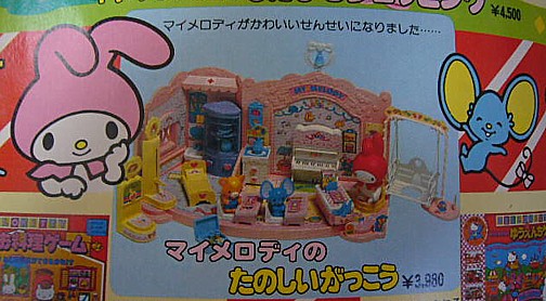 マイメロディのおもちゃは、キティちゃんやキキララの物に比べると少しマイナーというか、数が少ないような気がします。でも、私も一つだけマイメロディのおもちゃを持っていました。赤い屋根のメロディのおうちで、2階建てでピンク色の階段が付いていました。そして、この「たのしいがっこう」と同じく、メロディと水色のネズミ(フラット君)とキツネの人形も付いていました。キキララやキティちゃんの人形は硬いプラスチック製でしたが、メロディ達の人形はソフビ製でフニフニしていたのがやたら記憶に残っています(笑)。
