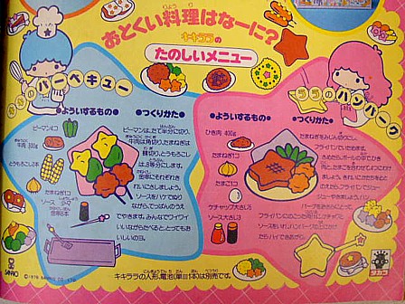 「たのしいメニュー」、星型という部分を除けば、なぜか実際に作れそうなリアルなレシピ(笑)!!ハンバーグについてはちゃんとひき肉のグラムまで指定してあります。幼稚園児にはちょっと難しそうですね(笑)。周りに散らばっている「お料理」がよく見るとみんな星型になっていて可愛いです。