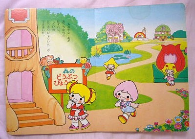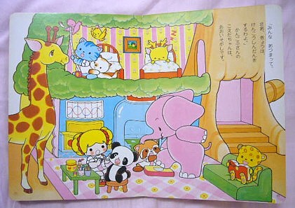 というものです。他のアニメの絵本に比べると、あまりにも文章が少なすぎて、上の説明で半分以上語ったことになってしまいました(笑)。それにしても、可愛らしい絵柄ですよね。文章が少なくても小さい女の子達は大喜びだと思います。それに、小さなキャラクターですが、こえだちゃんやそのお友達の服装なんかも、ちゃんとオシャレにデザインされてます。よく見ると、「森のどうぶつびょういん」以外のおうちも全ておもちゃとして発売されていた物が描かれています。「あっ、これ○○ちゃんが持ってるやつだ~」とか言いながら楽しむことができます。夢がありますねぇ~。