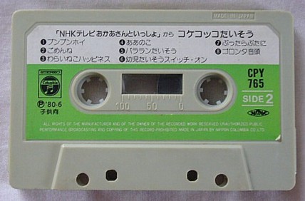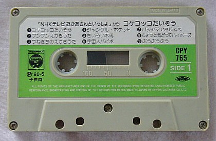 こちらで紹介している赤いカセットと同じく、もう何回聴いたかわからないほどで、画像では写っていませんが、テープの下に付いている小さなスポンジ(?)のような部分がボロボロになってしまっています。10年くらい前、「この部分がなくなったらもう二度と聴けなくなるかもしれない・・!!」と危機感を覚えて即効でMDにダビングしたので、テープ自体の崩壊で聴けなくなるという事態はなんとかまぬがれました(笑)。ちなみに、「おかあさんといっしょ」に限らず、私が持っている他のテープも最悪の事態に備えて同じ時期にMDの方に残したので、カセットというメディアがこの世から消滅しても大丈夫です。でも、なんだかんだでまだまだしぶとく残ってるんですよね。カセットって。
