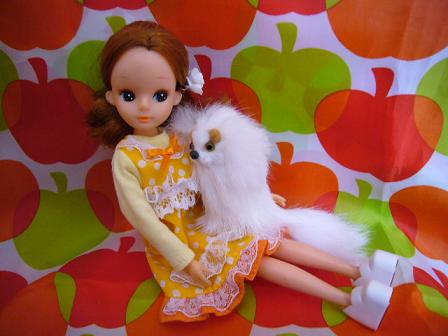 服は当時の物ではなく今発売されている物です。色使いや形が70年代風で着せてもあまり違和感がなく気に入っています。靴は何年か前に発売された「復刻リカちゃん」の物、ヘアピンは当時の物を真似して自作しました。犬(実はキツネなのかも??)はダ○ソーで買った100円キーホルダーなんですが、大きさもピッタリです。