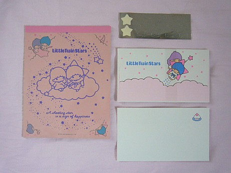 ララの髪の毛、普段は「ミンキーモモ」な色だけど、これは「クリィミーマミ」の色ですね(笑)。キキが背負ってる星がピンクというのも珍しいと思います。とても気に入っていたレターセットなので10年以上経った今もほとんど減ってません。おまけに、便箋に線が書かれていないので、まっすぐに文章を書くのが苦手な私にはちょっと使いにくい一品でもありました。厚紙に自分で等間隔に線を引いた物を下敷きにして、それを敷いて書いたりしていたのを思い出します。
