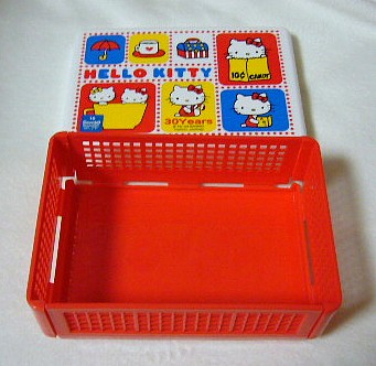 もったいなくてとても食品を入れる気にはならないので、小物入れとして使用中です。ピカピカで鮮やかな赤がまた可愛いです。こちらではミミイちゃんが袋に入ってたけど、今度はキティちゃんが入ってる・・・。キティちゃん達は猫だから袋の中が好きなんでしょうね。萌える・・。