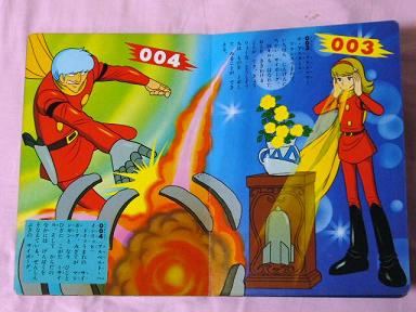 最初のページは009。「ジャンプりょくも すごい」と書かれています(笑)。「すごい」って何かイイですね~。スーパーガンについての説明が載ってるのが嬉しいです。というのも、私はなぜかあの銃がとても好きなんですよ。レーザー光線みたいなのが出るところもいいし、切り替え(どうやってるのかわからないけど)で麻痺光線に替えたりできるところもいいし。ピストルにも切り替えられるらしいけど、使ってるのは見たことがないなぁ。ハマった頃、009のおもちゃだったら絶対に「スーパーガン」が欲しいと思ってたんですが、オークション等でも見たことがないですね~。はたしておもちゃ化していたんでしょうかね?3種類に音が切り替えられるとか、引き金を引くと光って音が鳴る、とかそういう系だったらいいなーと思っていたんですけどね。特撮とかガッチャマンとかにありがちなおもちゃだと思いますが。