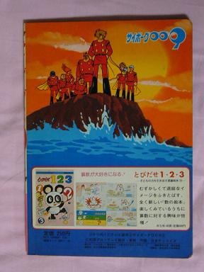 内容はといえば、全員で敵を倒してめでたしめでたし・・という物ではなく「ひみつ大特集」のタイトル通り9人の「ひみつ(能力)」が5ページ使って紹介されています。主役の009はひとりで見開き1ページ。後の8人はふたりづつです。それから、9人が乗る「ドルフィン2世号」、009の愛車「ストレンジャー号」も同時にチョコチョコと紹されています。
