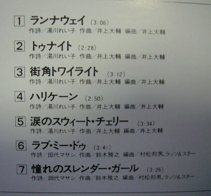 なんとか無事に終了です。名曲揃いで何もツッコミ所がありません。レビューの中でも語ってますが、「ラブ・ミー・ドゥ」「憧れのスレンダーガール」「サマーホリデー」「楽しき街角」「ストレイボーイ」は作詞が田代まさしさん、そして作曲は鈴木雅之さんです。そして桑マンの泣かせるトランペット・・・。今思えばすごいメンバーです。