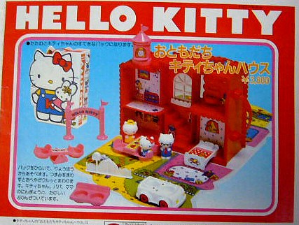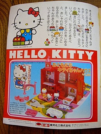 小学館の幼稚園84年12月号に載っていたキティちゃんのおもちゃです。キティちゃんのラジカセと同じく、広告のデザインがやたらスッキリした形になっていますね。 「両方から遊べる」っていうのがイイですね。お庭が二つあるとのことですが、お部屋も両面に付いてるんでしょうか。キキララのおもちゃは造形やパーツが細かいですが、キティちゃんのおもちゃは、持ち運びを便利にする・パーツが散らばらないようにする・片付けを楽にする・・・という所に力が入ってるような気がします。