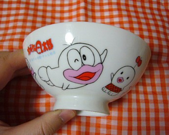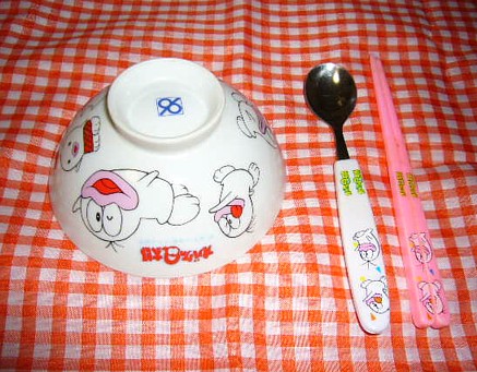 私が小学校低学年の頃に使っていた茶碗です。もう20年以上前の物ですが、とても奇麗にしています。当時はQちゃんが大好きだったので、いろんなグッズを揃えていたのがとても懐かしいです。いつ頃まで使ってたんだろう?と考えてみたんですが、中学の頃、「幽遊白書」の茶碗を使っていて、その間に他の柄の茶碗に買い換えた覚えがないので、おそらく85年~92年くらいまで使ってたんじゃないかな・・・と思います。7年近く使っていたことになりますが、子供にとっての7年って長いですよね~。