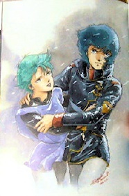 放送当時はアニメ雑誌を買えばこんなイラストが毎月見れたなんて・・・と、とてもうらやましかったです。 カミーユが凛々しくてかっこいいです・・・。とても美しいイラストですね。 |