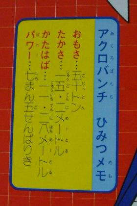 「アクロバンチのひみつ」となってますが、大した秘密でもなく、透視図はロボットアニメによくあるパターン。せっかく「6にんのかぞくはこのなかでくらしているんだ」と書かれているんだから、こんなメカっぽいのじゃなくて「部屋の間取り」が書かれていればよかったのに・・・。私が知りたかった秘密は載ってませんでした(笑)。
