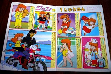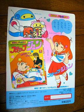 この「ステップジュン」もかなりマイナーなアニメですよね。正式なタイトルは「は~い!ステップジュン」なんですが、なぜかこれには「は~い」がついてません。放送されていたのは85年頃で、これは私も見てましたよ。ただし内容は全く覚えてませんが・・。あの2台のロボットの形がインパクトがあって、それだけよく覚えています。当時はぬり絵やきせかえ(紙製の)を持っていた記憶があります。発明好きな女の子が主人公で、主題歌もそういう感じでした。