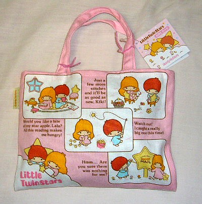 70年代後半にレッスンバッグとして発売されていた物をミニサイズに復刻した物で、あまりに小さすぎて(詳しく測ってませんが、A4の半分くらい??)あまり実用性はないと思いますが、鼻血モノの可愛さです。古き良き時代のキキララの世界がギッシリ詰まってます。上の画像は未開封の姿を撮影しましたが、この通り、バッグの手持ち部分をモコモコのモールで止めてあったのも懐かしさ満点でした。昔、お菓子等をプレゼントしてもらった時によくこういうモールで止めてあったんですよ。チープで可愛いです。