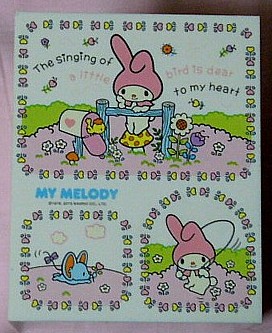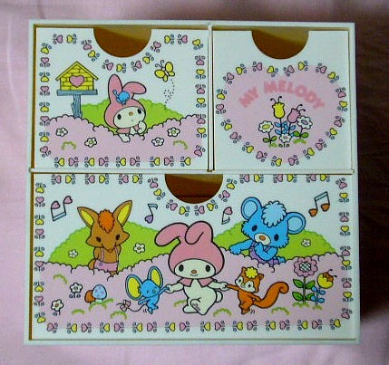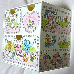 正面の引き出し部分だけでなく、箱の左右にもギッシリイラストが描かれているところが最強に可愛いと思います。しかも、このノスタルジックなイラストがまた・・・。メロディだけでなく、そのお友達がまた可愛いですね。それにしても、ピンクと白って色褪せが怖いです・・。どんなに用心してても外に出してると全体的に黄ばんでくるんですよね(T_T)