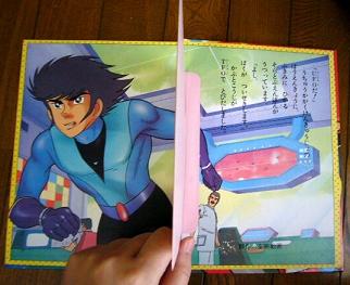 甲児がピンチなので、変身して助けに行くデュークフリード。ひかりのくにの絵本と同じく、変身シーンが細かく描かれていてナイスです。しかも、変身直前のデュークの「アミダぱぱあ」みたいなクシャクシャな顔!!その次に腕に戦闘スーツ、マスクがお面のように発生するという決定的瞬間が捕らえてあります。これは本編でも確認できなかったお宝画像であります!!このお助けシーンがまた素晴らしく、ピンチになった甲児くんは「うわっー!たすけてくれー!」と自ら助けを呼んでしまいます。「こうじくん!いま たすけるぞ!ブラッキーめ ゆるさないぞ」とその言葉に答え、助けに行くデューク・・・。本編ではどんなピンチに陥っても甲児君が助けを呼ぶことはありえない(多分)ので、これもまた貴重な1シーンだと思います。