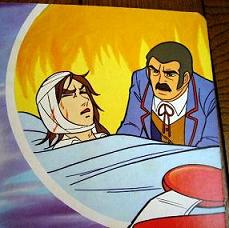 文章では「ベガ星人のUFOの怪光線を浴びて 傷ついた甲児を、大介と博士がやさしく看病し、その時に大介が甲児に自分の生い立ちを語った」ということが書かれています。それなら、ここの挿絵では傷ついた甲児を介抱するシーンを描きそうなものなんですけど、大介の回想シーンが描かれているのがなかなかステキです。フリード星脱出時の大介の重傷っぷりも確認できますね。